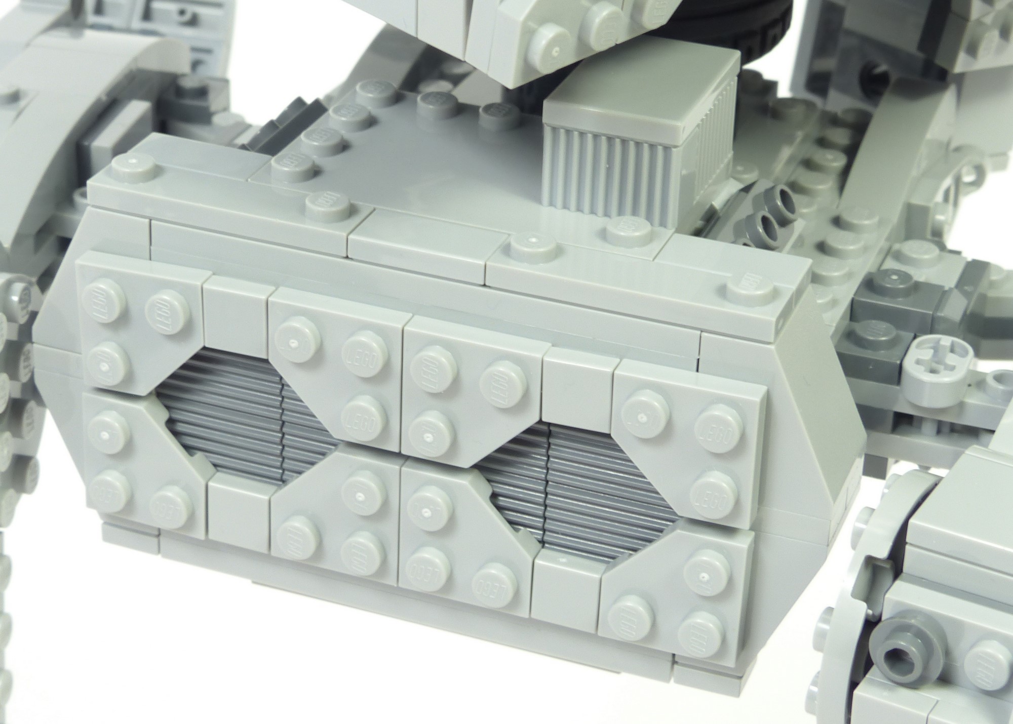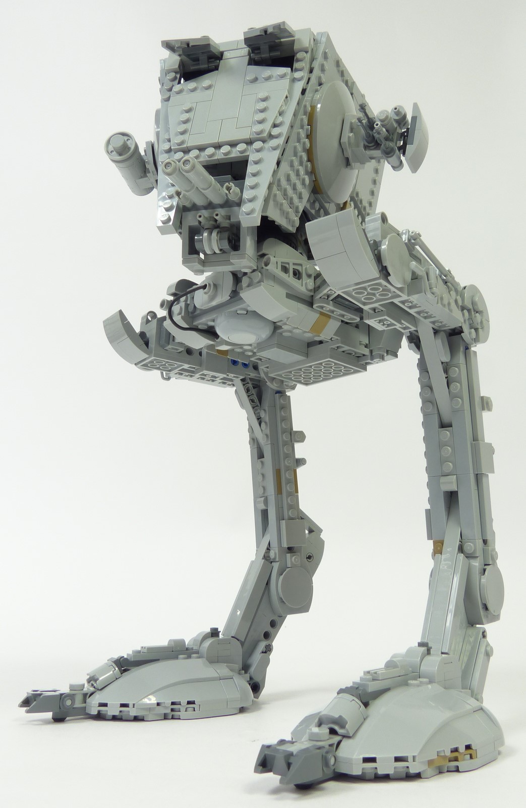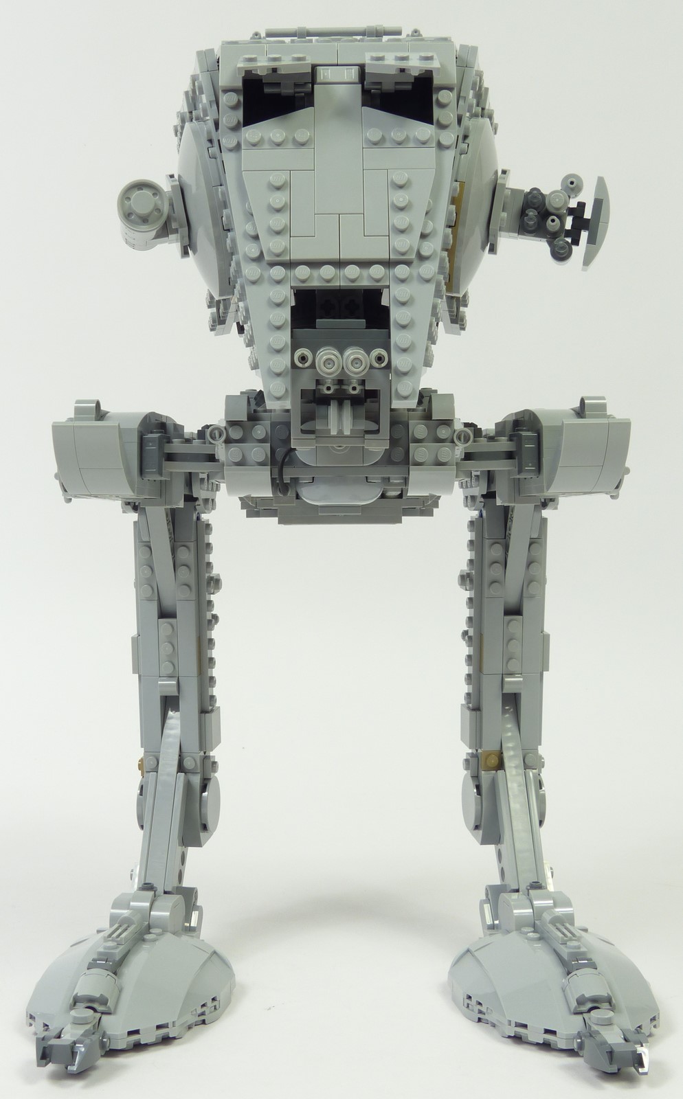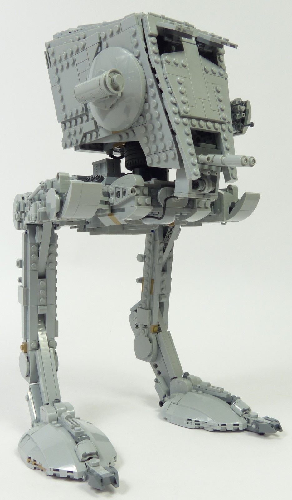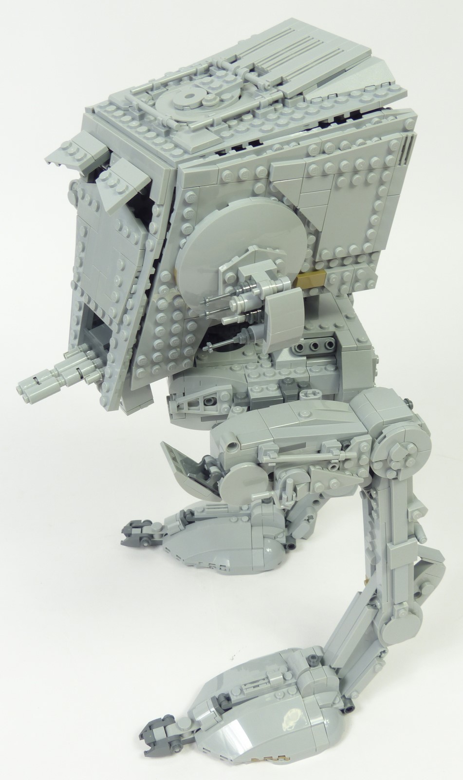 Concernant la forme générale, les angles des différents segments des jambes sont plutôt justes, à part le segment supérieur qui aurait mérité d'être davantage en pente. S'agissant des couleurs, notre version #75417 opte pour un gris clair quasi intégral là où la version de 2006 avait bon nombre de pièces gris foncé pour apporter des variations. Cette simplification des couleurs n'est pourtant pas préjudiciable à notre AT-ST. Les nombreux reliefs permettent d'apporter des textures et des variations plus subtiles que sur le #10174. L'autre amélioration notable concerne l'orientation des pattes en canard : cela confère une posture plus réaliste et plus dynamique à notre marcheur.