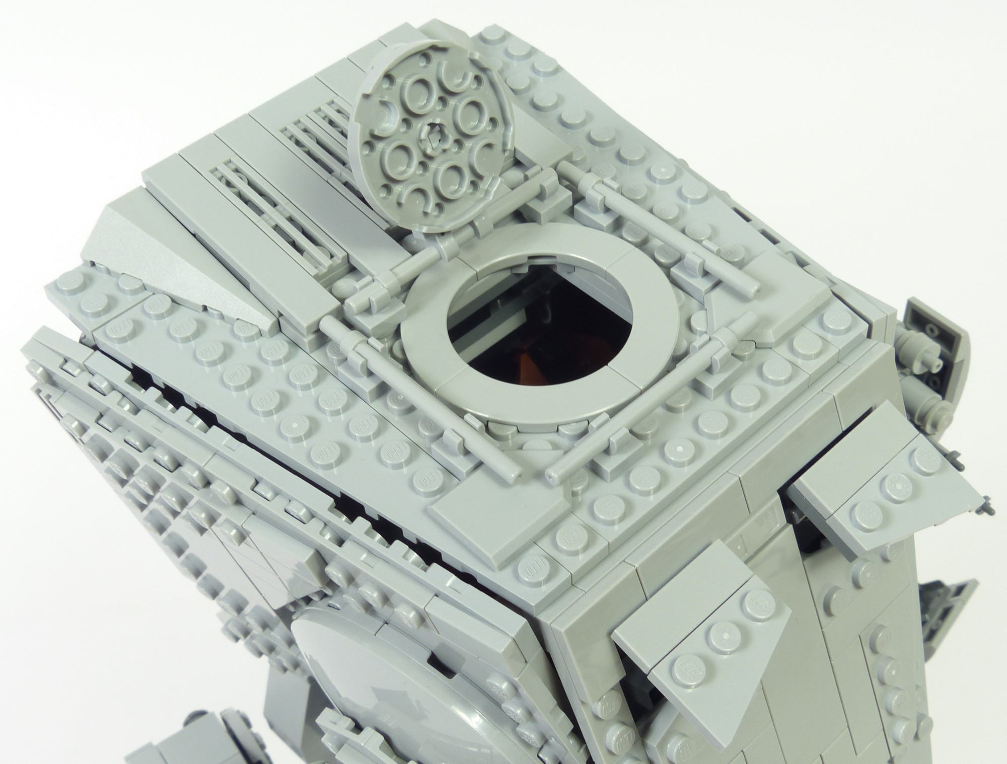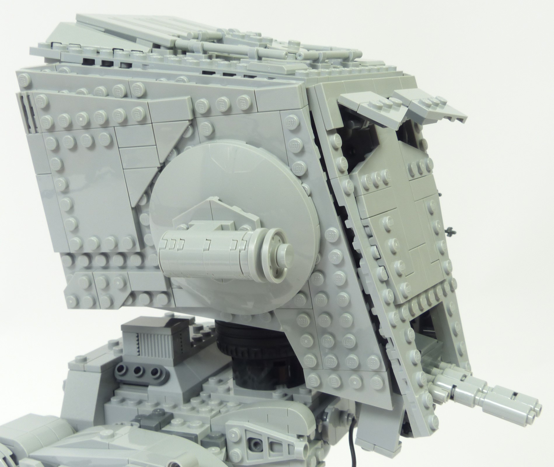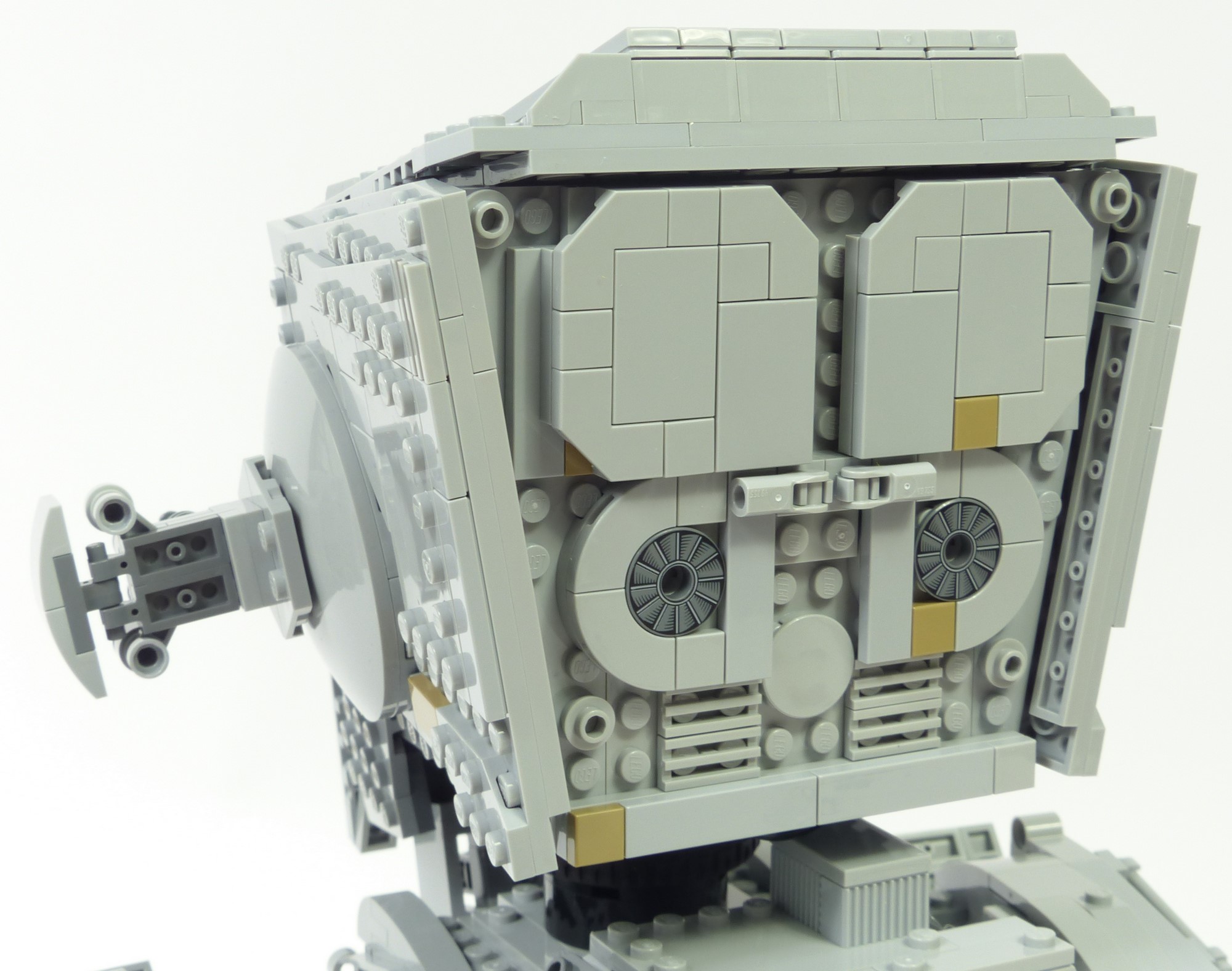 La cabine connait une amélioration majeure : sa forme est moins caricaturale, principalement sur la face avant où la silhouette en "V" est moins prononcée que sur le #10174. En terme de finitions, tous les détails sont parfaitement reproduits. On a le lanceur à concussion à gauche, le canon blaster léger à droite avec les dispositifs de visée, et les canons lasers jumelés sur le menton avec la petite roulette qui reproduit le point de pivot factice. Les hublots reprennent bien le design du modèle réel, et les surépaisseurs sur les faces latérales sont tout à fait conformes aux finitions présentes sur le vrai AT-ST. Sur la face arrière on retrouve les 2 grands carénages sur la partie haute, les ventilateurs, et quelques greebs discrets ; rien à redire. On appréciera aussi la qualité des jointures entre les différents panneaux qui composent la tête. Cela illustre bien l'idée que l'on est en présence d'un modèle UCS !
