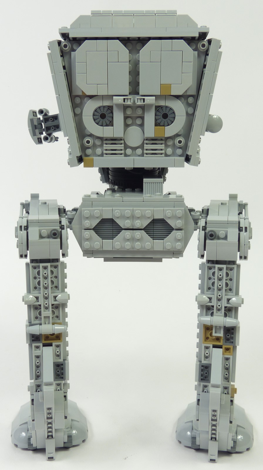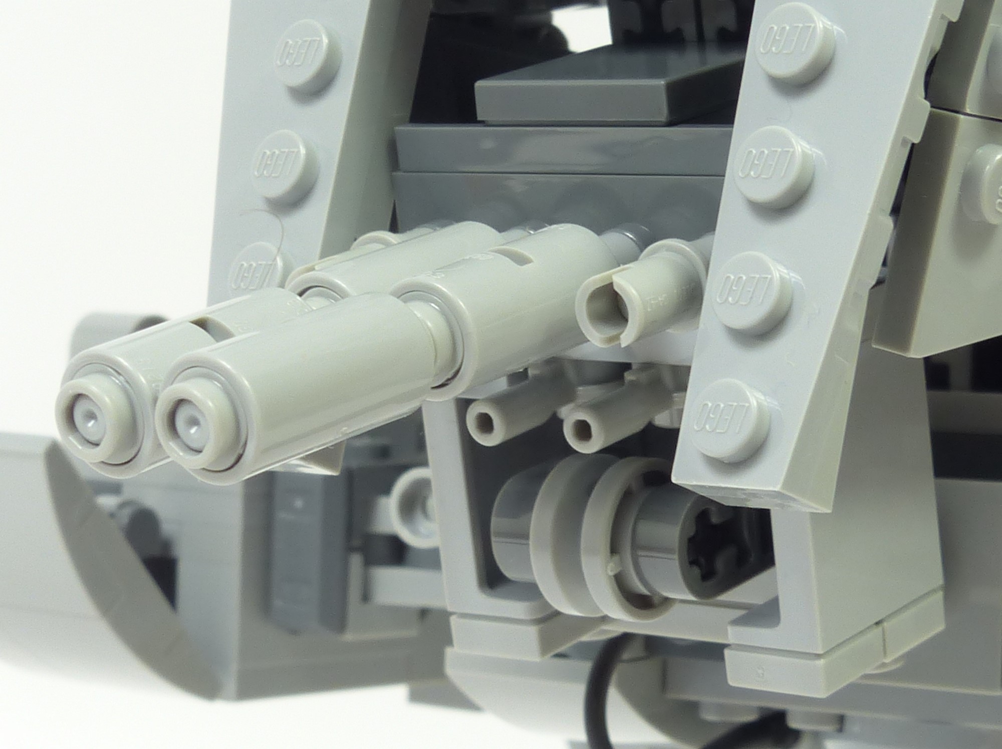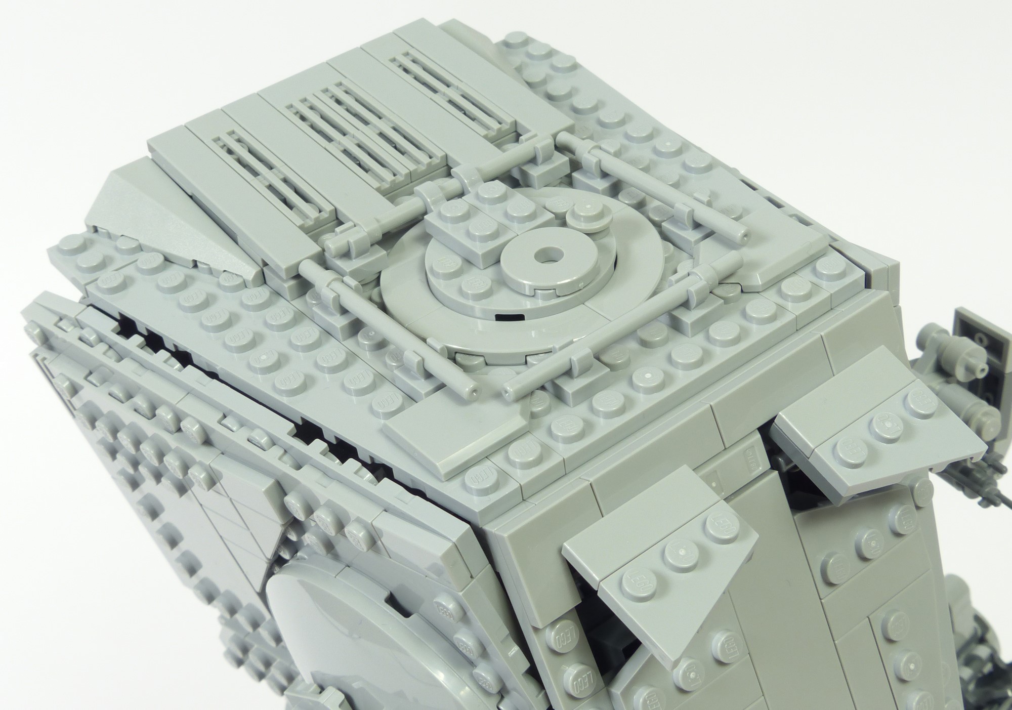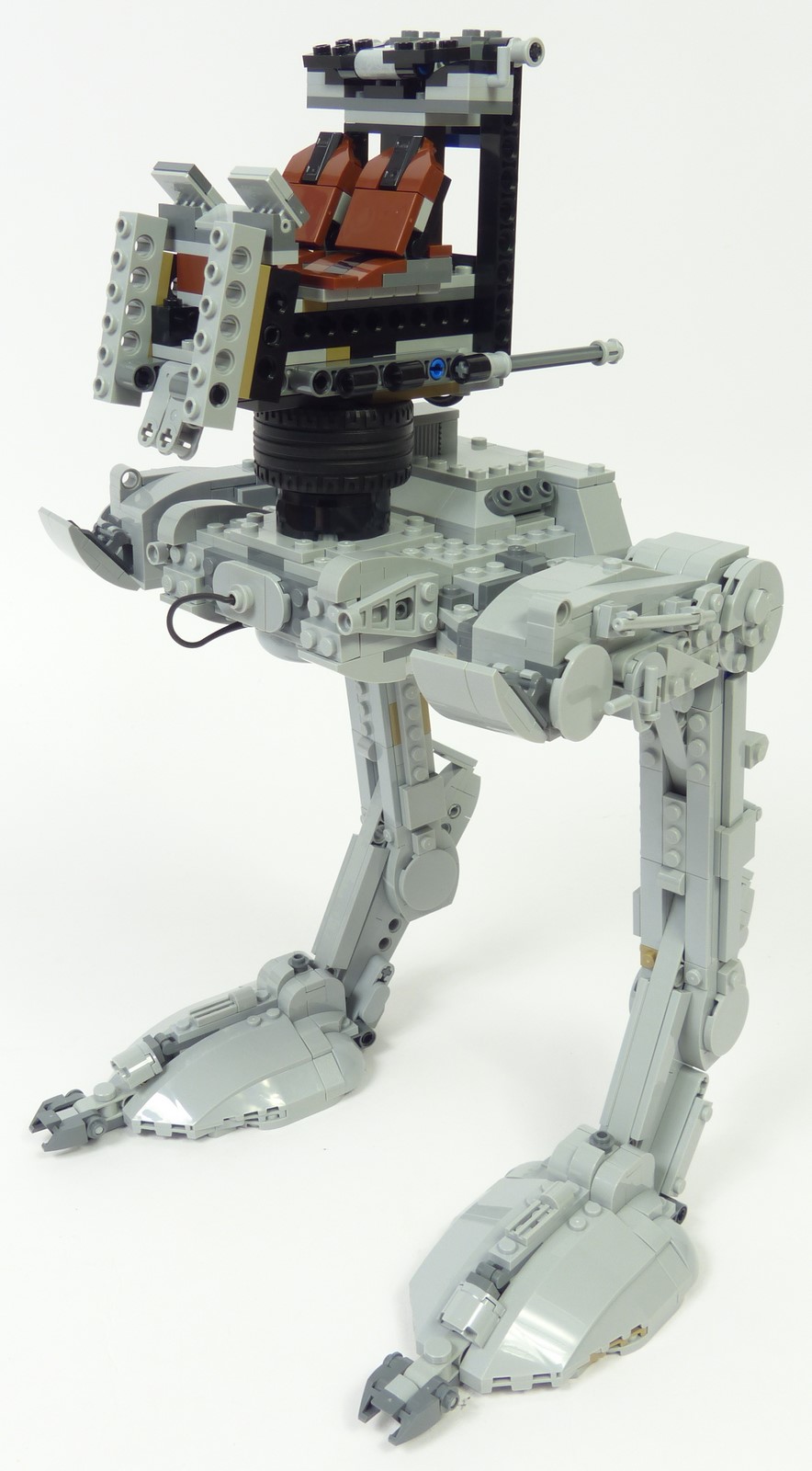 La cabine connait une amélioration majeure : sa forme est moins caricaturale, principalement sur la face avant où la silhouette en "V" est moins prononcée que sur le #10174. En terme de finitions, tous les détails sont parfaitement reproduits. On a le lanceur à concussion à gauche, le canon blaster léger à droite avec les dispositifs de visée, et les canons lasers jumelés sur le menton avec la petite roulette qui reproduit le point de pivot factice. Les hublots reprennent bien le design du modèle réel, et les surépaisseurs sur les faces latérales sont tout à fait conformes aux finitions présentes sur le vrai AT-ST. Sur la face arrière on retrouve les 2 grands carénages sur la partie haute, les ventilateurs, et quelques greebs discrets ; rien à redire. On appréciera aussi la qualité des jointures entre les différents panneaux qui composent la tête. Cela illustre bien l'idée que l'on est en présence d'un modèle UCS !
