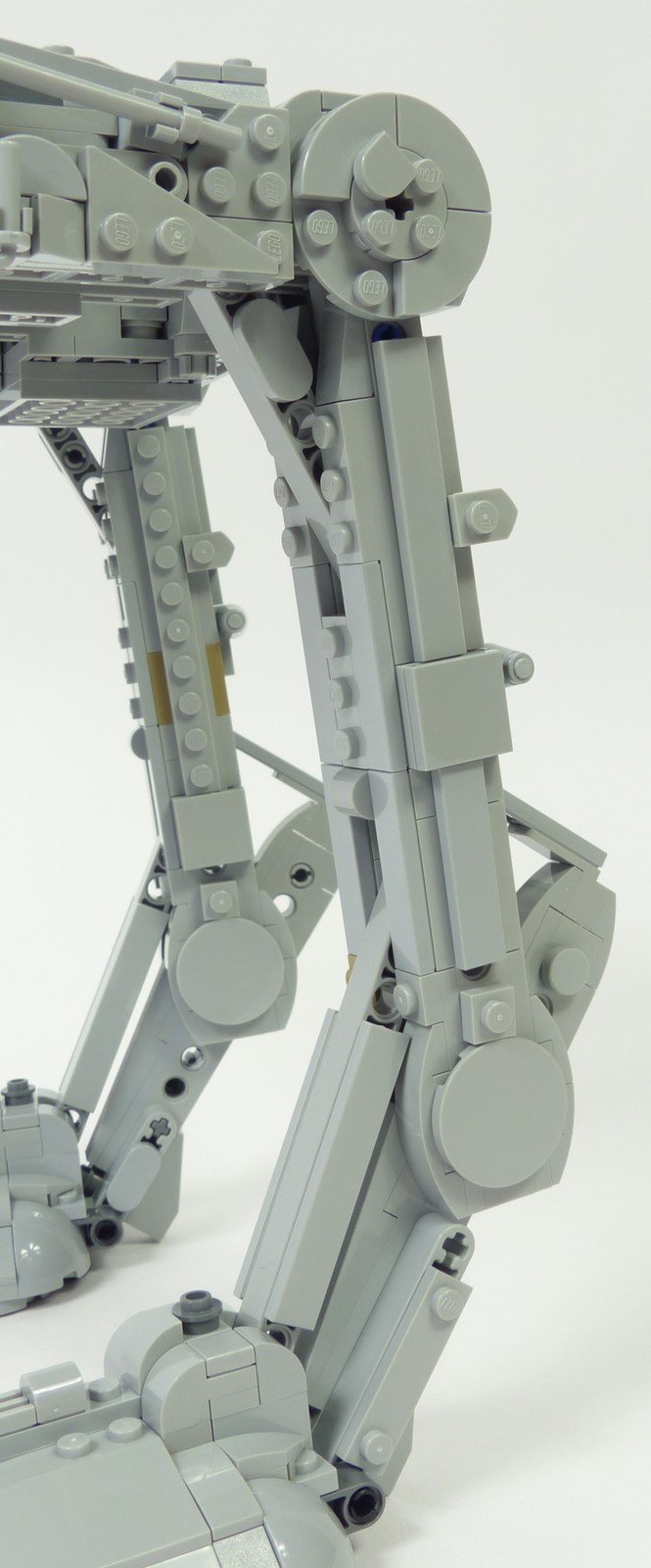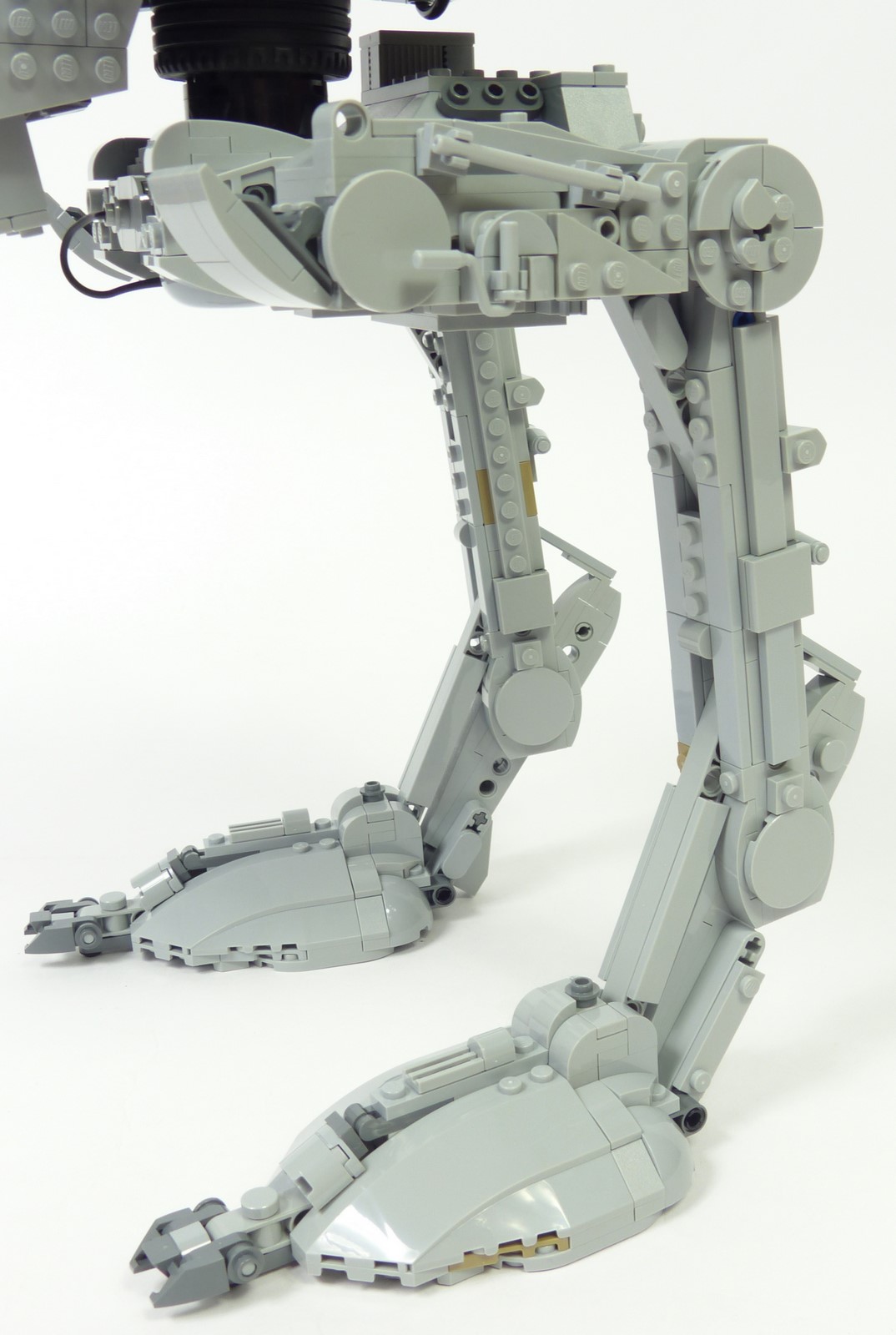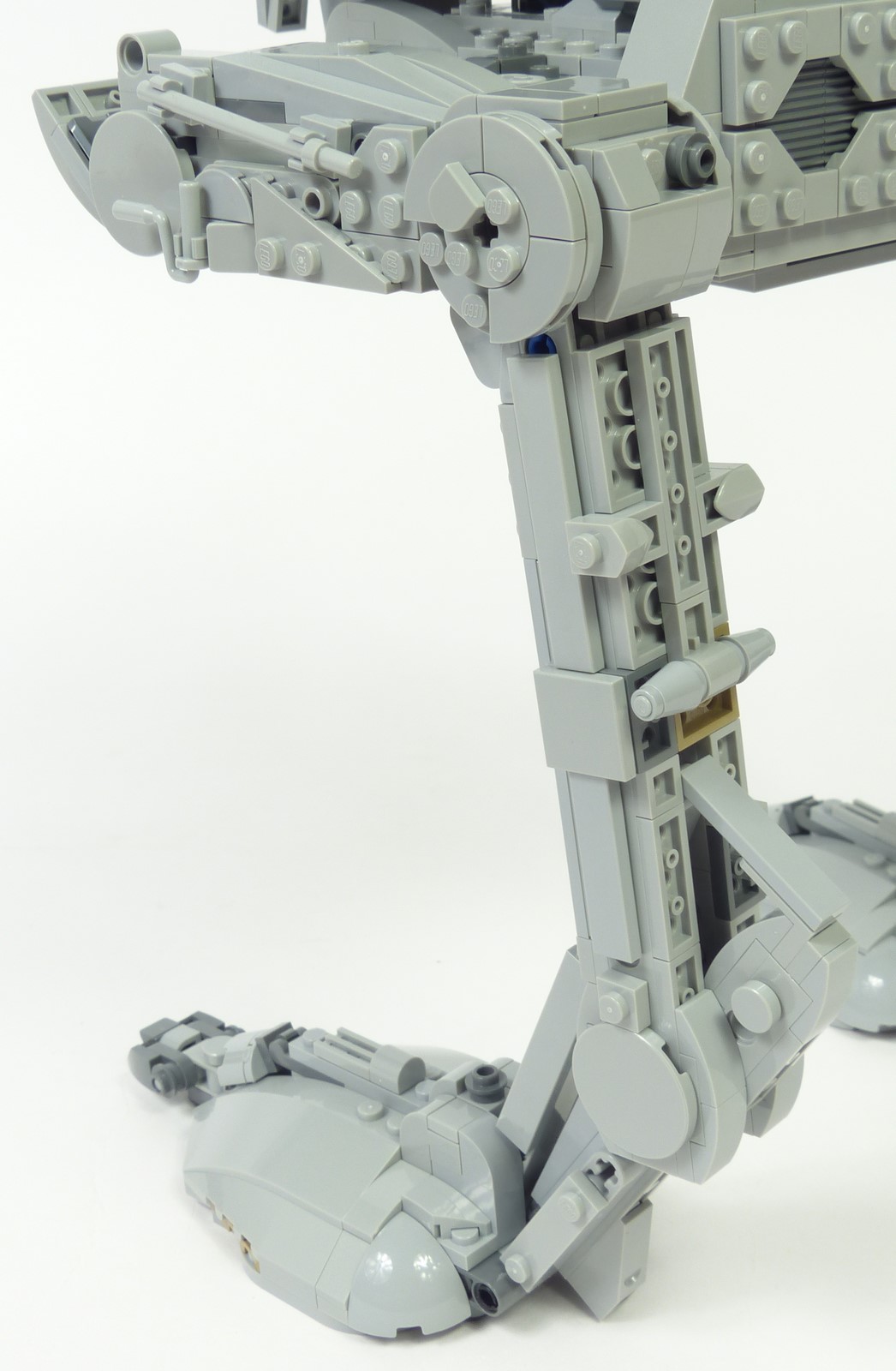 On analysera le bipode du bas vers le haut, donc en commençant par les pieds. Leur forme bombée et les détails sur la crête sont tout à fait semblables à ce que l'on peut observer dans l'Episode VI. Les griffes sont quant à elles bien plus réussies que sur le #10174 car plus tranchantes. Au niveau de la cheville, le résultat est également bien meilleur ; les slopes 6x1 comblent idéalement les espaces entre les structures Technic. A l'arrière, les tendons de cheville sont relativement fins tout en étant plus solides que sur le #10174. Et sur la partie supérieure, les greebs reproduisent relativement bien les détails tels qu'ils apparaissent dans le film.