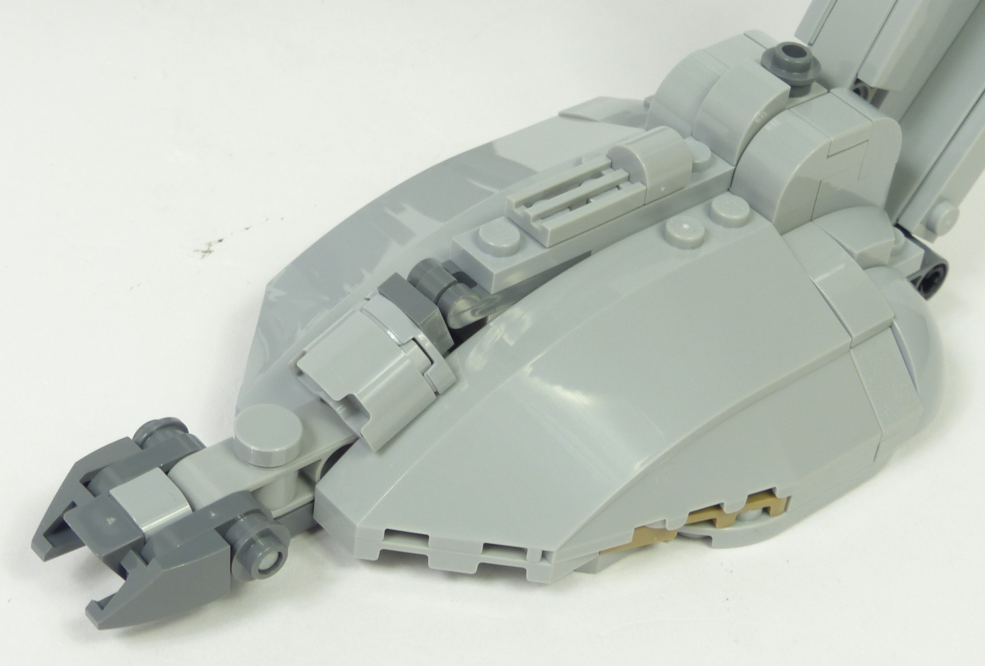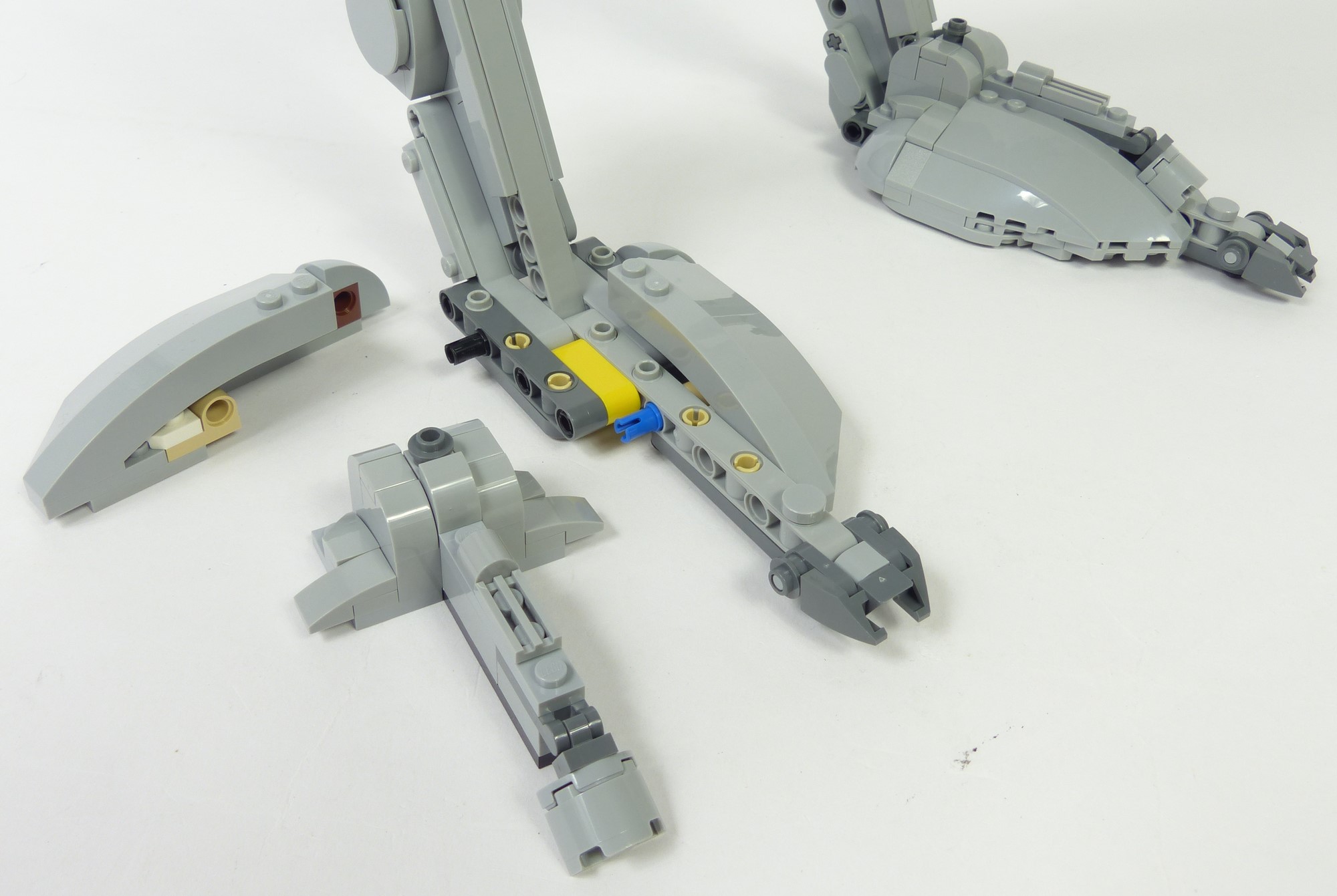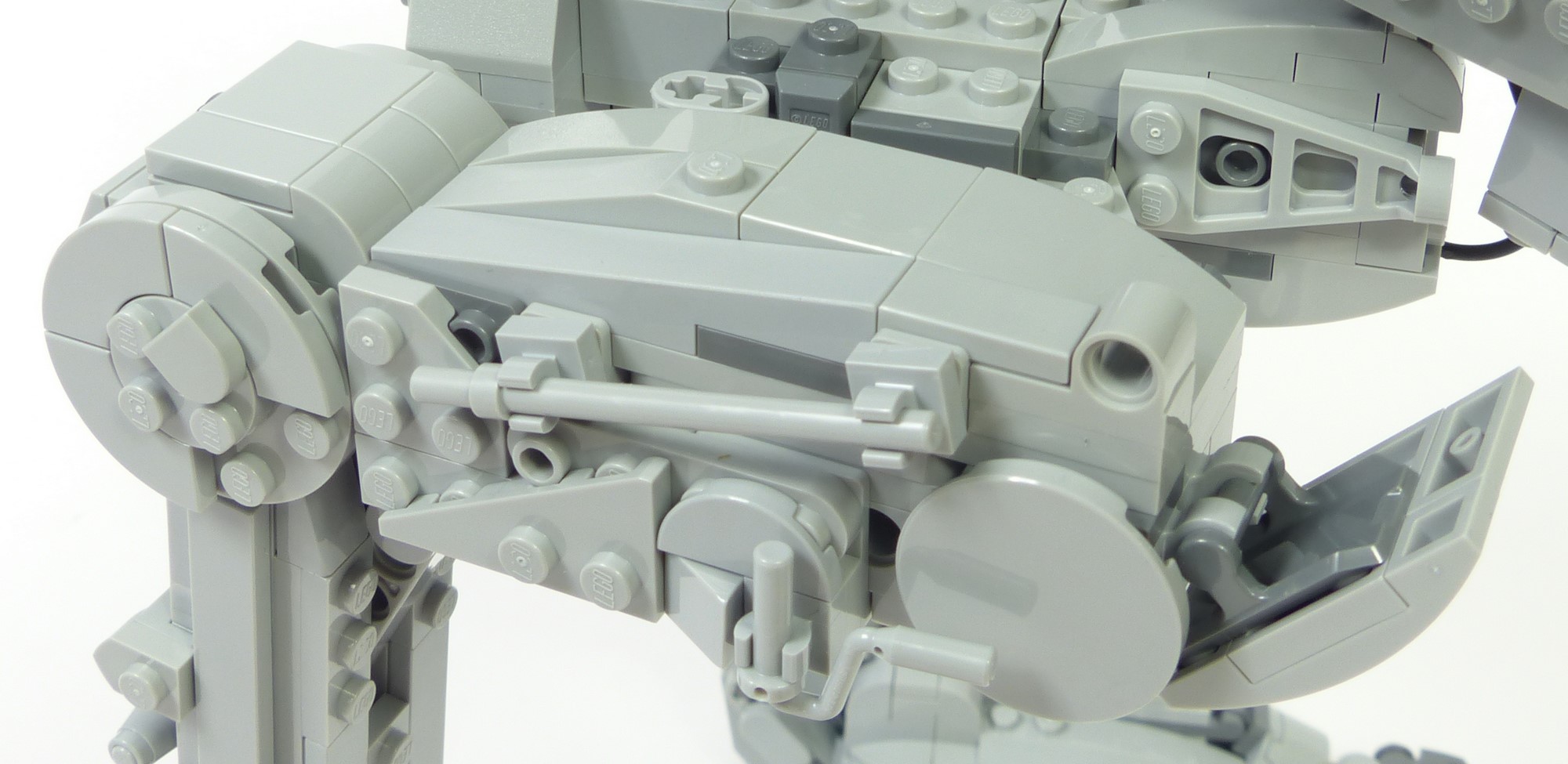 On analysera le bipode du bas vers le haut, donc en commençant par les pieds. Leur forme bombée et les détails sur la crête sont tout à fait semblables à ce que l'on peut observer dans l'Episode VI. Les griffes sont quant à elles bien plus réussies que sur le #10174 car plus tranchantes. Au niveau de la cheville, le résultat est également bien meilleur ; les slopes 6x1 comblent idéalement les espaces entre les structures Technic. A l'arrière, les tendons de cheville sont relativement fins tout en étant plus solides que sur le #10174. Et sur la partie supérieure, les greebs reproduisent relativement bien les détails tels qu'ils apparaissent dans le film.