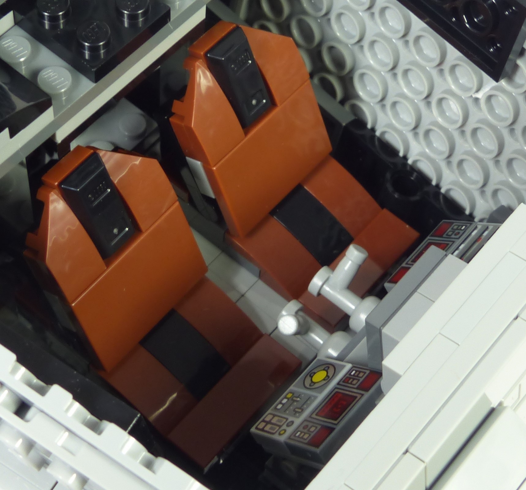 Sur la face supérieure de la tête, on retrouve bien le bloc arrière en pente pour reproduire le système de climatisation du cockpit. La trappe d'accès est elle aussi satisfaisante. On sera plus mesuré sur la main courante réalisée en 3 segments distincts. Sur le vrai AT-ST on voit nettement qu'elle n'est composée que d'un seul tronçon. Il aurait donc été bienvenu que Lego utilise un seul et unique flex pour la reproduire. La trappe d'accès peut s'ouvrir pour entrevoir le cockpit aménagé. Il est toutefois inévitable de relever la totalité du panneau supérieur pour pleinement observer les détails à l'intérieur. On y trouve 2 sièges, 2 manettes et des panneaux de contrôle. C'est bien, mais ça aurait pu être beaucoup mieux. Il semblait relativement facile de faire des sièges plus soignés, d'intégrer une console centrale et de détailler les parois intérieure gauche et droite. Bref, tout ça pour dire que notre #75417 propose le minimum syndical au niveau du cockpit.