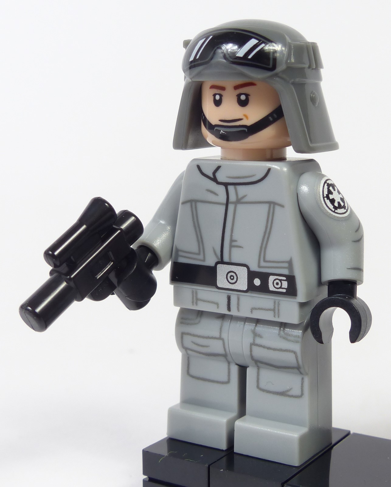 Vis-à-vis des proportions, le modèle n'est pas parfait car simplifié. Du fait de la construction des pattes en canard, le châssis est dans le même plan - quasi horizontal - que le segment supérieur des pattes. Cela ne devrait pas être le cas. En principe, le segment supérieur des pattes devrait être davantage en pente, et le châssis situé plus haut à l'aide d'un petit segment supplémentaire sur les pattes. Autrement dit, notre AT-ST est un peu trop tassé, et pas aussi élancé que ce qu'il devrait être. Les nombreux éléments mobiles sont un atout pour varier les poses. On peut ainsi modifier les orientations des 3 armements, incliner les volets des 2 hublots, ouvrir la trappe d'accès et faire tourne la tête. Sur ce dernier point, notre AT-ST connait d'ailleurs une nette amélioration : l'amplitude du mouvement passe à 110°, ce qui est bien supérieur aux 30° du #10174. En ce qui concerne le présentoir, Lego n'a pas résisté à mettre une figurine. C'est d'un goût toujours aussi douteux, surtout quand il s'agit d'un pilote d'AT-ST, une minifig qui n'a pas le moindre intérêt.